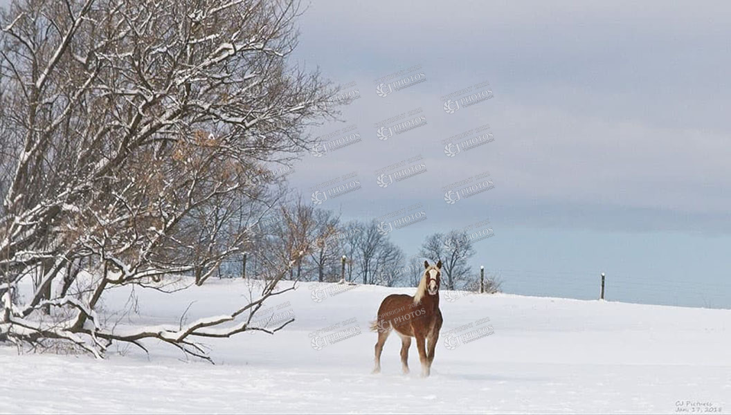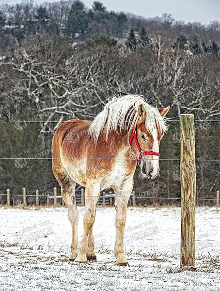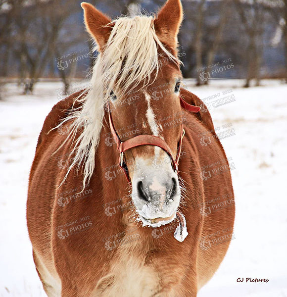 Beligum Horse enjoying warm day in the snow