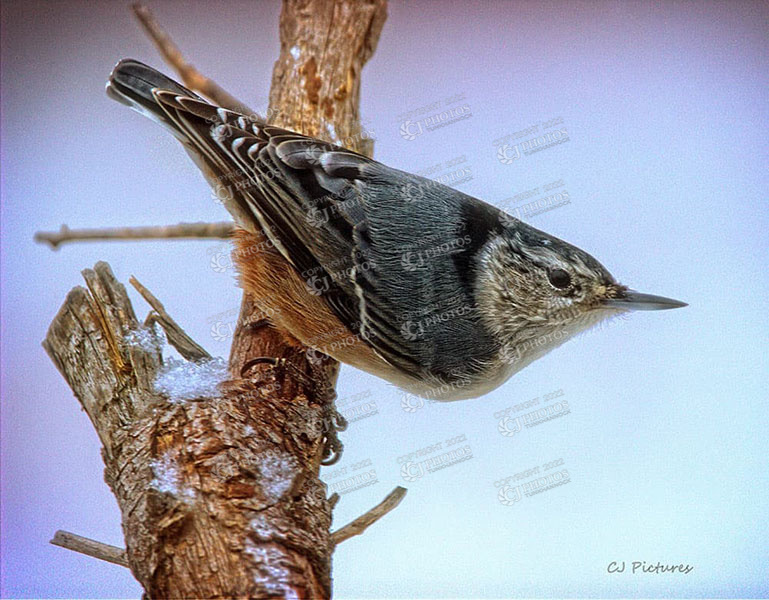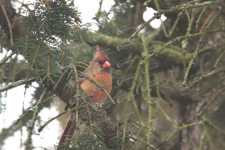 Red Cardinal, White sky, and the Blue from cold snow